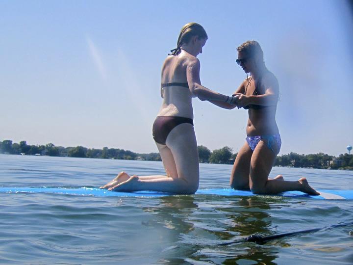 We float/don’t do much at all but sit/paddle out into the lake, singing songs in what I’m positive was completely off key, laughing, and trying to balance enough to both stand up on the board at the same time.  It was only a short time later that we both realized the current was a lot stronger than we thought, and we had drifted quite a bit away from the dock, safety, and our friends.